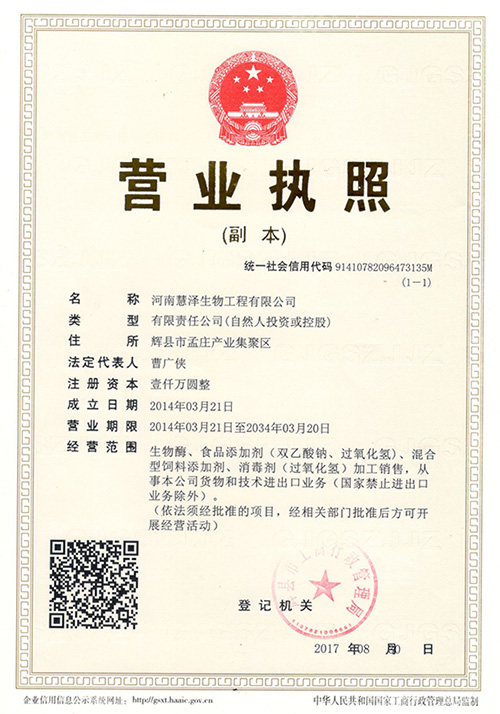 - 郑州慧泽生化科技有限公司是一家充满朝气的科研生产型高技术企业。目前公司业务主要集中在精细化工、食品化工和微生物制剂行业。公司现已建成郑州、焦作、新乡三个生产基地,其中河南新乡辉县孟庄生产基地占地70亩,总投资达1.2亿。现拥有年产100000吨过氧化氢消毒剂,年产8000吨的过氧化钙和年产5000吨的双乙酸钠的生产线,同时开设有生产总量5000吨的枯草芽孢杆菌、地衣芽孢杆菌等微生态制剂发酵生产车间。公司始终坚持“以人为本,科技兴企,品质优良,用户满意”的经营宗旨。为客户创造价值更多的价值...